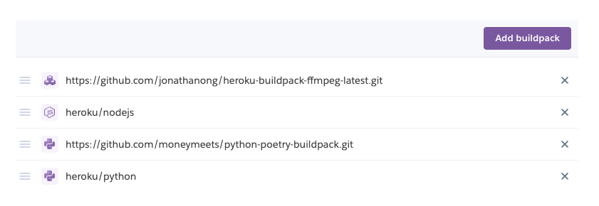 Adding a buildpack is pretty straightfoward, you can do it either via the Heroku CLI or via the Heroku Dashboard. Here's what the buildpacks for Lindy look like. Note: the ffmpeg buildpack is specific to Lindy, you likely don't need it.